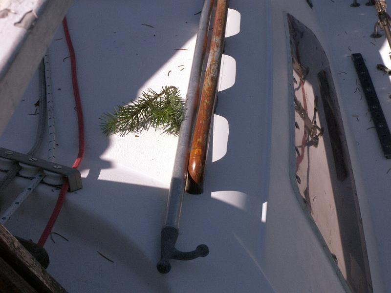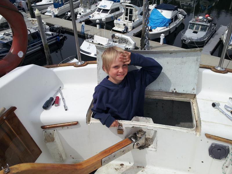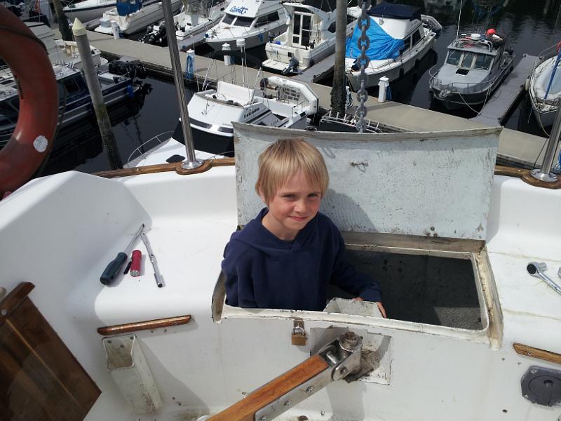 17 As part of the backstay chainplate refit, I need to remove the oak trim at the back of the boat. It's bolted through, so I have to get to the nuts on the bottom. There's NO WAY for an adult to get in their now, so I had to recruit a helper.