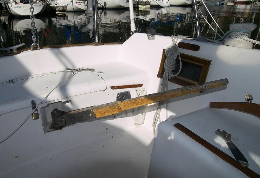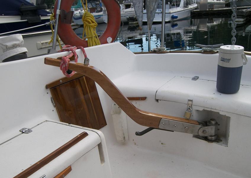 More importantly, I wanted to add an autopilot. This meant the tiller had to be fully horizontal, but when horizontal, the angular travel was limited by the lazarettes. A new tiller was clearly called for, but a custom tiller was going to be WAY too expensive for my budget.