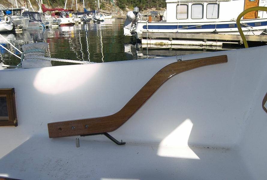 First, by being straight and mounted low, it had to be lifted significantly to be used, effectively shortening it. I could manage it, but Savannagh had some problems with the reduced leverage in heavy seas.