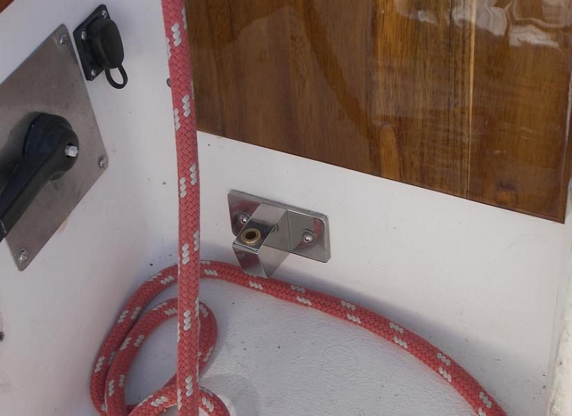 The autopilot bracket is mounted here on the bottom, using cross drilled and tapped rod, the holes hidden with mahogany plugs. Similar bolts and plugs are used to hold the tiller extension on the top.