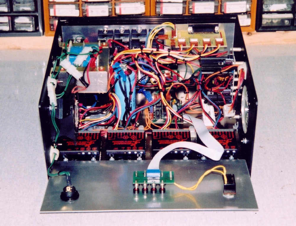 Inside, it's certainly crowded. On the back panel, you can see the relays, and in the middle is the GERC. On the right side are a pair of switching power supplies, one for 5 volts, one for 12.